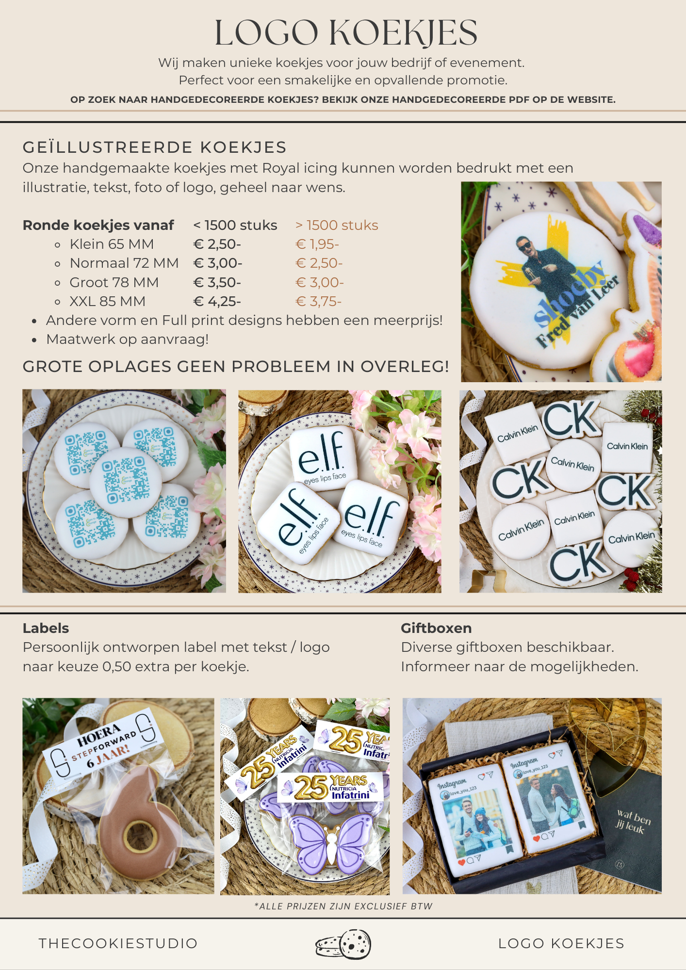 - Logo Koekjes: Laat je logo afdrukken op onze heerlijke koekjes. Beschikbaar in diverse vormen en maten, verpakt in individuele zakjes voor een professionele uitstraling.